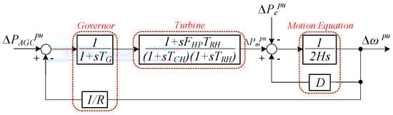 The frequency control diagram of a real SG is illustrated in Figure 1, and the corresponding parameters are defined in Table 1. Since only the primary frequency regulation and inertial response are of interest in this work, the automatic generation control signal (ΔPAGCpu) is neglected. To analyze the effect of rotational inertia on the system frequency response, the transfer function of frequency deviation (Δω) over the load disturbance (ΔPe) is derived as (4).