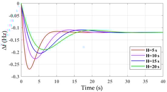The grid frequency response under a 5% step-up change in the demand (ΔPe = 5%) is depicted in Figure 2 for different values of H. It is clear that increasing H results in a lower RoCoF level and frequency nadir and, thereby, better primary frequency regulation during the transient time.