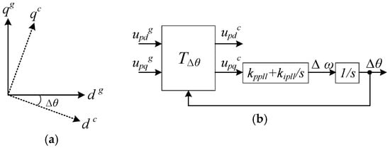 The averaged model of the synchronous reference frame PLL (SRF-PLL) is shown in Figure 4b, in which the PCC voltage vector in the dqg frame is rotated to the dqc frame using matrix TΔθ for feedback control purpose []. During steady state operation, we can conclude (12):
