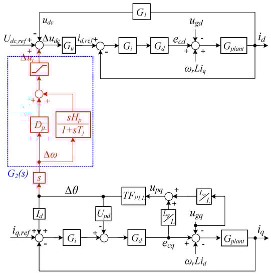 In addition, the frequency support can be provided by incorporating the angular frequency deviations (Δω) into the DC-link voltage regulator. Mathematically, Δω is equivalent to the time-derivative of Δθ, as illustrated in Figure 4b. Thereby, the transfer function between Δui and id is derived as: