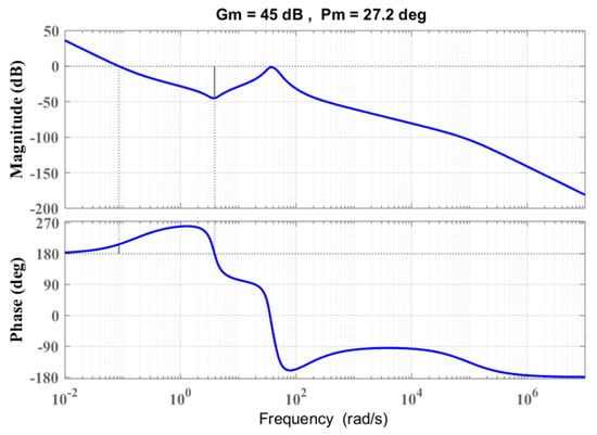 The stability of the system is investigated by bode diagram and zero-pole map analyses. Figure 6 depicts the bode-plot of the frequency response of the open-loop model, with the parameters listed in Table 2. As can be seen from this figure, the gain and phase margins are 45 dB and 27.2 deg, respectively, which validate the stable operation of the model described by (26). Moreover, the zero-pole diagram of the closed-loop transfer function (27) is demonstrated in Figure 7. The zeros and poles are represented by circles and crosses, respectively. It is clear that all the poles are located in the left-hand side of the complex plane, which signifies the stability of the whole system. Therefore, the proposed controller is mathematically proved to operate stably.