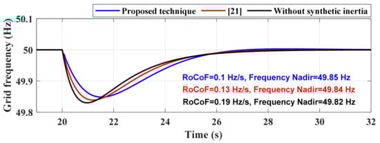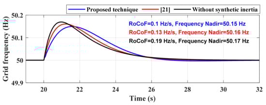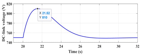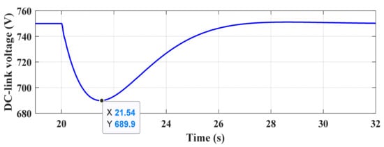 In this scenario, a 5% step-up change in the demand occurs at t = 20 s. Figure 9 depicts frequency variations when the grid-interactive converter is controlled by the (1) proposed controller, (2) method in [], and (3) conventional control system without virtual inertia functionality. As observed from this figure, without providing synthetic inertia, the frequency nadir and RoCoF peaks at 49.82 Hz and 0.19 Hz/s, respectively, and the grid frequency is stabilized after 6 s. The VSC system augmented with the proposed virtual inertia loop can improve the RoCoF level by 47.37% and 23.1% compared to the conventional controller and [], respectively. Moreover, the proposed technique yields lower maximum frequency oscillations (i.e., 49.85 Hz) in comparison to the other ones. It should be mentioned that further providing inertia support by the method in [] leads to the instability of the whole system, which is in agreement with the stability analysis presented in Figure 8. Thus, better primary frequency regulation during transient time is achieved with the proposed supplementary controller. The DC-link capacitor voltage oscillation is illustrated in Figure 10. The voltage drops to 690 V right after the step change in the load and returns to the nominal value (750 V). It means that the discharged energy by the DC-link capacitor supports the frequency, which is analogous to the released kinetic energy of SGs during perturbation.