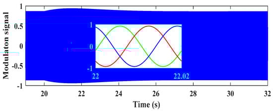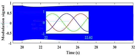The same analysis can be carried out for the decrease in modulation index when the DC-link voltage starts to rise. This is because the difference angle Δ must increase while the reactive power exchange remains zero during contingency (again, the equation ed = ma × udc × cosΔ = upd holds true). Then, the modulation index decreases as the DC-link capacitor voltage increases. The modulation signal in this scenario is observed in Figure 15. The power absorbed by the VSC with the aim of frequency support is also brought in Figure 16. The power reaches approximately −15 kW after the loss of demand and becomes zero when the grid frequency returns to 50 Hz.