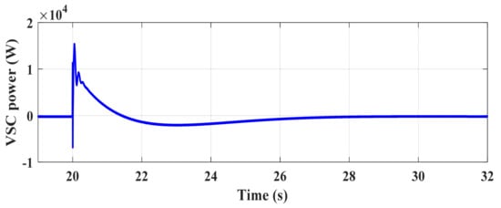 As stated earlier, the DC-link voltage deviations must be limited, which means to a finite frequency support level. When the DC-link voltage is reduced with the aim of frequency support, the modulation index (ma) must increase in order to (1) increase the difference angle between converter voltage and PCC voltage (Δ) and (2) prevent reactive power exchange with the grid (i.e., the equation ed = ma × udc × cosΔ = upd holds true). This can be observed in Figure 11. The modulation index peaks at around 0.93 in the time interval at which the capacitor is discharged. Then, it rebounds to the value of pre-perturbation. The supportive power supplied by the VSC is shown in Figure 12. It is clear that the power reaches approximately 15 kW and then drops to the steady state value when the frequency returns to 50 Hz.