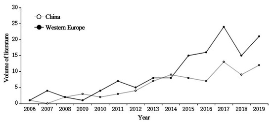 Based on WoS statistics of the number of core papers on “industrial heritage” research since the 2006 Wuxi Forum, the number of documents in 2006–2019 changes over time (Figure 1). The development trend of the literature quantity shows the changing trend of academic attention to research topics within a certain time range. In terms of the fluctuation of quantity, China and Western countries maintain the same change in research focus on industrial heritage.