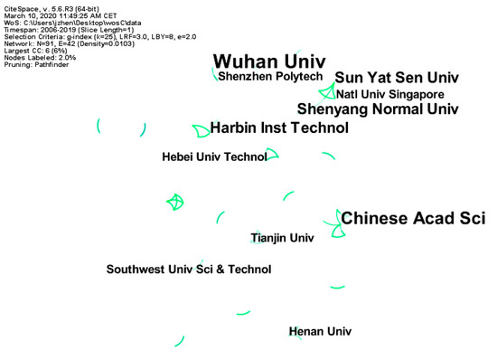 The number of papers issued by research institutions reflects the research capacity of the studied institutions to a certain extent. Through the statistical analysis, the development process and results of each research institution can be effectively distinguished [18]. There are 91 nodes and 42 connections in the map (Figure 3). The largest number of papers is at Wuhan University (5), followed by the Chinese Academy of Sciences (4) and Sun Yat-sen University (3). The research institutions shown in the map are research groups with more than two papers issued between 2006 and 2019—this distribution of institutions is similar to the distribution of researchers.