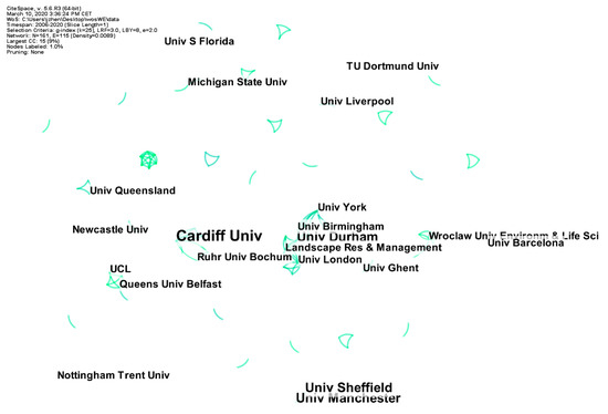 There are 161 nodes and 151 connections in the map (Figure 6), of which the largest number of publications come from Cardiff University (4); second is the University of Durham (3), the University of Sheffield (3), and the University of Manchester (3), indicating a strong scientific research influence. Combined with the above analysis of national cooperation networks, it is found that the number of national publications and the strength of their influence largely depend on the scientific research capacity of key national research institutions. In the scientific research teams shown in the atlas (with more than two papers), universities occupy the mainstream and the volume and influence of papers are all above the institutions.