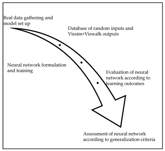 The aim of this paper is to investigate the possibility of applying neural networks in the calibration of a microsimulation model of pedestrian movements. Pedestrian behavior has its own specifics and is influenced by the cultural milieu perhaps more than vehicular movement [1,17,18,19]. Also, the pedestrian population includes all vulnerable groups, from children at the beginning of their independent movement, to elderly pedestrians with mobility difficulties as well as pedestrians with various disabilities (motor disabilities, low vision, etc.) [18]. Given the greater dispersion of reaction times and velocities of the pedestrian population in comparison to the driving population, the question of the possibility of predicting the crossing time in the conflict zone becomes critical for model calibration [19,20,21]. Also, although walking is part of the transport system, having its own particular behavioral rules and characteristics, it cannot be simulated by the behavioral model normally used for cars. The aim of the present work is to obtain a reliable model to predict one aspect of the simulated pedestrian behavior. The developed procedure is the first contribution to the development of a calibration methodology, whose final goal is to fine-tune non-directly measurable modeling parameters on the basis of a model output that is characterized by its easy measurability. For this purpose—based on previous experience—neural networks were selected as a possible applicative tool. The selected neural network will be trained, validated and evaluated in order to create a predictive model of pedestrian simulated behavior at a specific location type. Crossing times of pedestrians walking on a zebra crossing at a roundabout entry leg will be both simulated and calculated by the network and results compared. Tests are also developed to underline which input parameters have the greatest influence on the selected output. Herein, a limitation of the research presented in this paper should be pointed out: since it deals with the formulation of the model to predict the micro-simulated behavior of pedestrians, representing the first important step towards the development of the whole calibration methodology, the calibration of the initial model parameters cannot be worked out. Of course, a check of the validity of the developed microsimulation model was carried out, in order to understand if it reproduced a realistic behavior. Nevertheless, a precise calibration of the model needs its parameters to be fixed. To train the neural network, it is necessary to create a huge number of combinations of the model’s parameters—which are each time different, in order to make the neural network learn the relationship between these parameters and the selected output. Only at the end of the whole calibration process is it possible to apply the selected, trained neural network to obtain the combination of input parameters which, put in the microsimulation model, gives the best output, i.e., the crossing time which is the most similar to the real, measured crossing time.