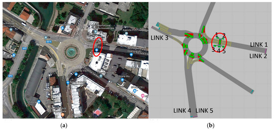 Comparison between: (a) the real intersection; (b) the microsimulation model network.