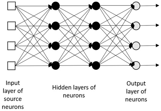 Ward nets, better known as feedforward networks, are neural networks structured in such a way that the neurons of a layer have the outputs of the neurons in the precedent slab as input signals [43]. A feedforward network, in which each neuron of one layer is linked to the ones of the adjacent layer, is called fully connected [43]. An example of a fully connected feedforward network can be seen in Figure 3.