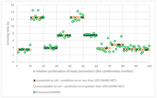 An additional database corresponding to the 20% of the initial one was generated after network training and testing. This completely independent database, which did not participate in either the training set or the test set in the neural network learning process, served to independently confirm the ability to generalize the selected neural network. Indeed, the goal of training a neural network is to achieve a good generalization, being able to be applied to much larger databases than the one on which it was trained. In the specific case, the neural network trained on a database of 100 combinations, will be applied to 3–4 times larger databases, which compare crossing times measured in real traffic conditions and crossing times as obtained by microsimulations using the neural network prediction function implemented in the calibration process for different values of input parameters.