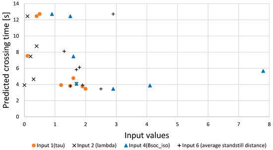 Finally, a first rough comparison between real-world measurements and the outputs of the neural network shows that the majority of the predictions stands in the range of [4,12] s, which very well approximates the crossing time measured in situ, belonging to the range [4,14] s. Also, the mean value, though it is the result of the training step and therefore is not the final desired outcome, shows a difference with the mean measurement of 1.95 s. In Table 10, basic descriptive statistics are reported.