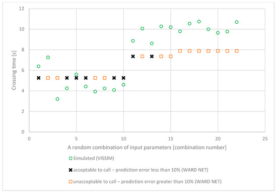 To further evaluate the results of the formulated neural network, a comparison with two additional data sets of real-world measurements was worked out. The first data set consists of new data measured at the same location on a different day of the week. As can be seen from Table 11, the achieved data have the same distribution of the original data set, with a mean value of 7.91 s for the crossing time.