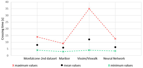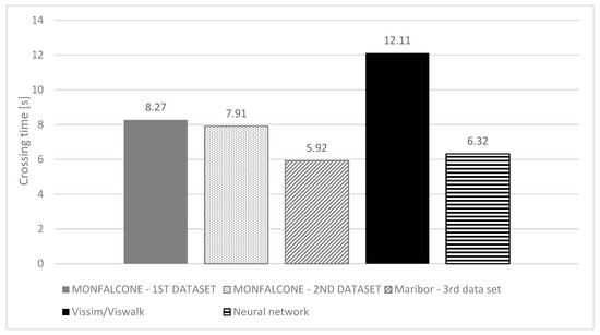Comparing the real data of the two locations to the results of the microsimulation model and of the formulated Ward network (Figure 9), various observations can be stated. Figure 9 shows the mean values achieved by the three data sets: real measurements, micro-simulation results and predicted outputs. Firstly, an important difference can be noticed between the results of the microsimulation model run with default parameters and all the other measurements, with an error equal to 3.84 s, 4.20 s and 6.19 s respectively considering the first data set recorded in Monfalcone, the second set of data collected at the same location and the results of the measurements done in Maribor. Comparing the mean crossing time predicted by the neural network to the measurements in situ—listed following the previous order—the errors equal 1.95 s, 1.59 s and 0.40 s, respectively.