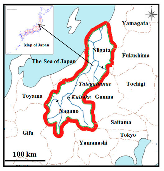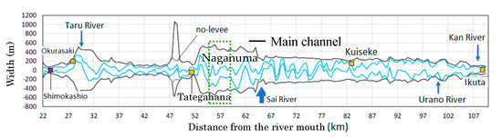 As shown in Figure 10, Tategahana is the narrowest point of the river course within the Nagano Prefecture. During a large flood event, such a significant contraction of the river’s width can cause a significant backwater effect on the water level in the upstream reach. Preliminary simulations using HEC-RAS modeling system [37] indicated that Naganuma district is within the backwater zone when the flow discharge at Tategahana station is assumed to be 7000 m3 s−1.