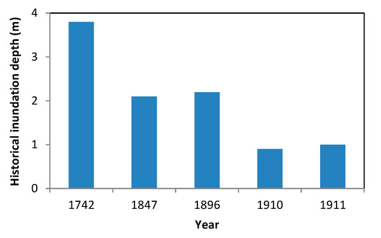 According to historical records [28], the Naganuma district had been flooded several times from the Edo period 1603–1868) to the Meiji period (1868–1912). The inundation depths of these flooding events were marked on the pillar of the main hall of a temple near the levee breaching site, as shown in Figure 3.