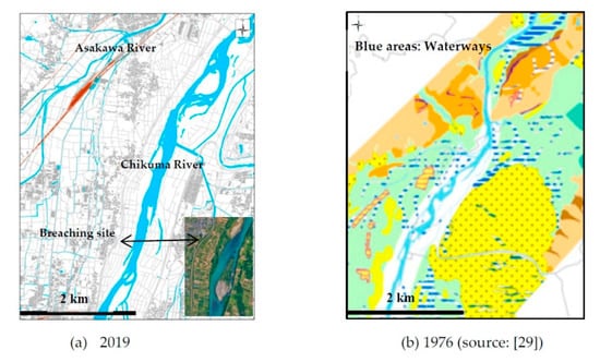 Figure 4 shows the main geographic characteristics of the district as well as an old map of the area. The district is surrounded by the Chikuma River and the Asakawa River. The map of current landform shows that the river course is curved around the breaching site, although only mildly so, and the district is located on the concave side of the river bend. Such a landform makes this area prone to flooding. The map of the district about half a century ago, obtained from the Geospatial Information Authority of Japan [29], indicates that there were quite a number of small waterways in the district in the past that have now been transformed into land. Because of the landform, agriculture in this area had often been affected by flooding. In 1897, local famers started planting apple trees because apple cultivation has a higher level of resistance to flood damage compared to sericulture, which was the dominant business in this area before 1897. This initiative can be evaluated as an adaption measure and has proven to be successful. Over the years, Nagano City has established its reputation as a major apple grower in Japan, and the majority of residents in Naganuma district are engaged in the apple business in some way. From a vulnerability point of view, this initiative reduced the susceptibility to the impact of flooding, since apple trees are more resistant to flood waters and provide a stable and good income to the community during normal years.