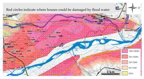By using the building inventory database of the Geospatial Information Authority of Japan [32], the distribution of residential houses in Naganuma district was mapped and plotted together with the spatial variation of the surface elevation in the district (Figure 7). Besides, the percentages of houses in different risk zones are also shown in Figure 7. It is clear that many houses were indeed constructed in relatively less dangerous locations. Such a data analysis revealed that the local community has taken certain measures to reduce the degree of susceptibility to flooding.