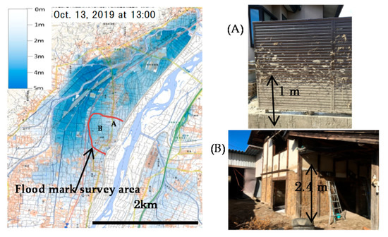 Figure 5 shows the flood hazard map prepared by the Nagano City government [30], indicating that the projected maximum inundation depth in Naganuma district could be as high as 20 m. Figure 6 shows the flood water depth distribution on 13 October 2019, produced by the Geospatial Information Authority of Japan (GSI), based on satellite images [31]. Our field survey on flood water marks left on the walls of residential houses revealed that the flood water depth in Hoyasu subdistrict, which is the main residential area of Naganuma district, varied from 1 m to 2.4 m as shown in Figure 6, which is due partially to the backwater effects of buildings. This validated the flood depth estimation of the GSI. By comparing the actual flood water depth distribution with the projected flood water depth in the flood hazard map, it appears that the inundation area matches the projection, although the water depth was lower than the projected possible maximum value. This proves that the flood hazard map for this area provided reliable information on high flood risk zones. Meanwhile, it also serves as a reminder that flood hazard maps need further improvement to provide more accurate information on inundation depths and thereby facilitate risk management.