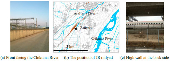 In contrast to the residential areas, however, the JR railyard for bullet trains is situated in the northeast part of the district, where the ground surface elevation is the lowest in the district. Our field survey found that the protective measures at the front and back of the railyard are different, as shown in Figure 8. At the front of the yard, facing the Chikuma River, the foundation was raised by about 2 m, and trains can be seen from outside the yard. At the back, however, there is a 4-meter-high wall. As can be seen from Figure 8, the Asakawa River (with its two tributaries) is closer to the back of the railyard than the Chikuma River is to the front of the railyard. In 1983, the Asakawa River flooded and inundated an area of 248.5 ha, with 331 houses being flooded above floor level. Since the railyard was constructed in the 1990s, it may be postulated that the high wall at the back of the railyard was constructed to protect against flood waters from the Asakawa River. This suggests that the East Japan Railway Co. had taken measures to reduce the exposure of its facility to flooding from the Asakawa River. However, it may have underestimated the exposure to flooding from the Chikuma River. According to the document archive of Nagano City, the local community supported the construction of the high-speed Shinkansen railway line and associated facilities in the district but requested the early construction of a dam in the upstream of the Asakawa River in 1993. In subsequent years, the dialogues between the city office and the local community have been pretty much focused on the flood risk imposed by the Asakawa River [33]. The fact that the local government and residents were more concerned with the Asakawa River would have led the East Japan Railway Co. to pay more attention to the Asakawa River than the Chikuma River in its flood risk management.