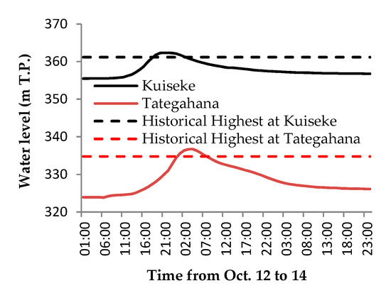 The design rainfall for the Chikuma River at the Tategahana station is 186 mm/48 h, which has a 1/100 probability of occurrence. During Typhoo No. 19, the two-day total rainfall was 193.7 mm, exceeding the design rainfall by 4% according to data of Japan’s Meteorological Agency. Furthermore, the maximum 24 h rainfall exceeded historical records by 50%. Therefore, the rainfall brought by Typhoon No. 19 can be characterized as intensive heavy rainfall.