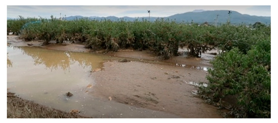 For the river reaches within Nagano City, a large portion of the floodplains are used as orchards, mainly of apple trees, as shown in Figure 11. It is well documented that the presence of vegetation on floodplains may affect channel conveyance, because it increases the channel roughness coefficient, reduces the cross-sectional area and lowers channel conveyance [38,39,40,41,42,43]. For the river cross section at the breaching site, the ratio of the width of the vegetated zone to the total channel width is about 0.5, according to our field survey. A laboratory experiment showed that when the ratio is 0.5, the conveyance could be reduced by 20% [44]. A recent study [45] indicated that peak flood stages could be decreased by 13–34 cm after the clearance of invasive plants. From the viewpoint of flood risk management, vegetation developed on floodplains due to human activity should be removed or managed properly to ensure the safe passage of floodwater. However, an issue in Nagano City is that these floodplains are owned by farmers, and fruit cultivation on floodplains has become a major source of income for the local population. Therefore, the Japanese government cannot simply order agricultural activity on the floodplains to be stopped. Consequently, the combination of possible backwater due to channel width contraction and vegetation effects may have increased the susceptibility of Naganuma district to flooding.