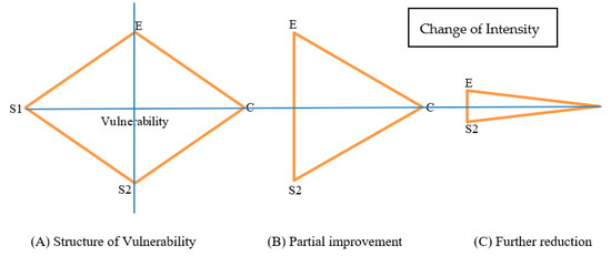 The area of the diamond represents the level of vulnerability, and the four vertices represent Exposure (E), Coping Capacity (C), Susceptibility to direct life loss and injury (S1) and Susceptibility to non-life impacts (S2). For vulnerability management, the top priority should be the minimization of S1, ideally to zero, through enhancing coping capacity. This translates into transforming the diamond to a triangle. Then, via further coping capacity enhancement such as better land-use planning and regulation and better insurance systems, both E and S2 can be reduced, transforming a fat triangle into a thin triangle. This simple conceptual model can help decision-makers prioritize policies to effectively reduce disaster vulnerability step by step and contribute to better urban planning. It could also be used to conduct a better evaluation of disaster reduction policies by elucidating which component of susceptibility is more influenced, or whether both S1 and S2 could be simultaneously reduced. For Naganuma district, this framework placed its vulnerability status close to the B stage. Namely, it reduced S1 to a large extent, but had a limited effect on S2. To move to the C stage, new policies are required to reduce both E and S2 via coping capacity enhancement. Such an enhancement could come from a combination of river engineering work to reduce exposure and better insurance as an incentive for farmers to abandon farming on floodplains or seek crop change in order to reduce S2.