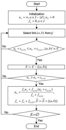 The new model is a mixed-integer model. To solve this model and find the optimal link for the optimal strategy, Spiess and Florian [28] already proposed the optimal strategy searching algorithm to find the best solution for the above model. The search algorithm is illustrated in Figure 1.