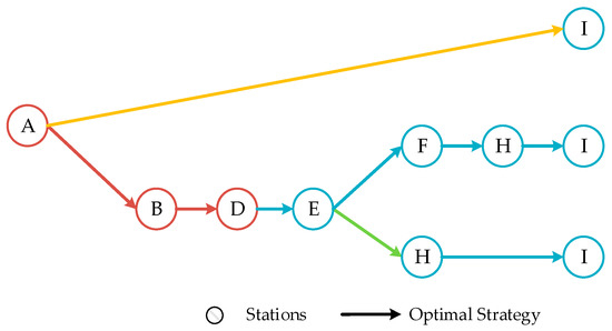 There are two kinds of nodes in the optimal strategy tree. Some of the nodes are connected with only one link, such as Node B and Node D in Figure 3. For some of the nodes such as Node A and Node E, there is more than one connecting link. This means that the passengers could make their choice at these nodes according to the train arriving time or the link service frequency. This also follows the assumptions that were described by Spiess and Florian in 1989 [26]. To better distinguish these multi-link nodes, we refer to these nodes as the strategy node.