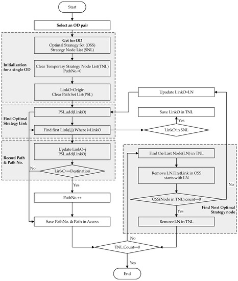 The searching algorithm can be divided into four parts. The first part is the initialization section, which resets all of the sets that have been discussed for a specific OD pair. The second process is to find the optimal strategy link for the given link start node. The path and path number along the searching process are recorded in third part. Finally, if the visited node contains the optimal strategy node, the process will find the next optimal strategy part. The depth-first path generation algorithm is illustrated in Figure 4. These four parts are utilized in seven steps.