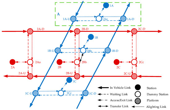 For a transfer station, one thing should be clarified in advance. In Beijing, the transfer station is a combination of several individual stations that are connected with transfer tunnels. The platforms and entrances/exits are not shared. Take Figure 5 as an example. If a passenger enters Station 1B and wants to take Line 2, he or she should go to the transfer tunnel and go to Station 2B. From this, there is a transfer link that is connected to the dummy Nodes 1Bb and 2Bb.