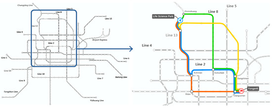 Life Science Park is on Line 13 and the destination Yonganli is on Line 1. The paths are represented in different colors. The red and blue paths share the same route until they reach Xizhimen Station, which is a transfer station for Lines 2 and 13. Line 2 is a ring line. Jianguomen is the transfer station for Lines 1 and 2. The two transfer stations are located diagonally in Line 2. The passengers can go clockwise or anticlockwise to reach their destination, which makes the red and blue paths. In the morning peak hour, the train frequency for the Line 13 clockwise direction is pretty high. Some passengers will choose the clockwise direction to reach Line 2 at Dongzhimen. After that, they finally get to the destination, which is the yellow path. In addition, the transfer walking distance in Guloudajie is shorter than the other transfer stations. Some passengers go in the clockwise direction and they transfer to Line 8 at Zhuxinzhuan Station, which is on the green path.
