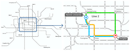 For some of the other OD pairs, they also have alternative paths during their trip. Although it is different from the previous OD pair, the paths are not in the clockwise or anticlockwise direction for the ring line. Take Renmin University to Dongdan as an example, as shown in Figure 7.