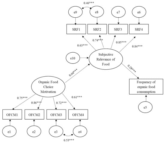 The mediating role of subjective relevance of food. Standardized parameter estimates for the final model. Note: *** p < 0.001; N = 964; e = error; OFCM1, OFCM 2, OFCM 3, OFCM 4 are the organic food choice motivation items; SRF1, SRF2, SRF3, SFR4 are the subjective relevance of food items.