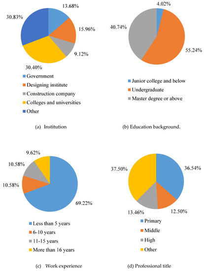 The questionnaire designed in this paper consists of four parts: Description of the questionnaire, respondent’s background, the survey of the index of importance degree, and the respondents’ suggestions for the setting of the index. The questionnaire used the five-point Likert scale to evaluate the importance of 45 secondary indicators. The Likert scale usually has five or seven points, and this study uses a five-point Likert scale. A total of 110 questionnaires were distributed in the survey, 104 effective questionnaires were collected, and the effective rate of recovery was 94.5%. Respondents’ information is shown in Figure 1.