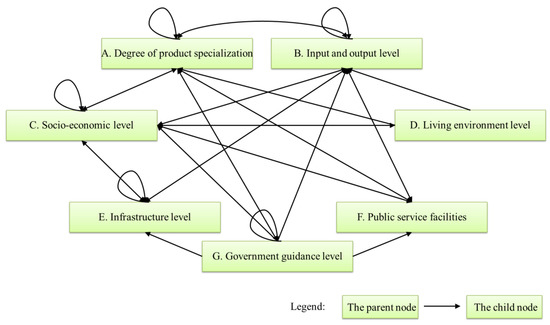 (2) Establish a network relationship between elements. Since the characteristic town selection evaluation index developed in this paper is not completely independent, there is a certain influence relationship, so the ANP method is used to calculate the weight. This paper took the tourism-type town as an example, through the consulting literature, analyzing index data, understanding the meaning behind the index and discussing with the relevant researchers. We can judge and obtain the correlation of the index in the tourism-type town evaluation index system. As shown in Table 4, the first column is the parent node and the second column is the child node affected by the parent node, which can construct a complete ANP structural model. The ANP structural model for building tourism-type characteristic town is shown in Figure 2.