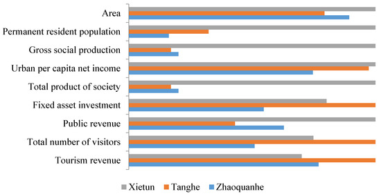 Xietun Town, Tanghe Town, and Zhaoquanhe Town are the first batches of national-level characteristic towns, and the leading types of the three towns are essentially the same, which are all dominated by tourism, driving the development of other related industries. The relative value such as the area of the administrative region of town and a resident population of the three towns are shown in Figure 4.