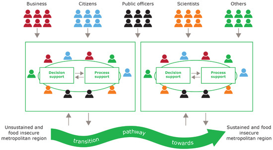 The main aim of this article is to contribute towards urban food security in metropolitan areas by combining the need for stakeholder participation in model-driven decision support to develop transition pathways [11,12]. For this purpose, we will present a stakeholder-inclusive approach to decision making in food system transitions: the Transition Support System (TSS) approach. In this TSS approach, decision support tools and participatory processes are mutually employed to support urban food security. As we will show in this article, there are important benefits to combining stakeholder-based and modeling-based methods in promoting food system transitions contributing to better informed decision making in a dynamic context where unforeseen factors and new priorities of stakeholders can be included. Our TSS approach also aligns with the UN’s New Urban Agenda, which envisages an involvement of stakeholders in transformation of the urban food system.