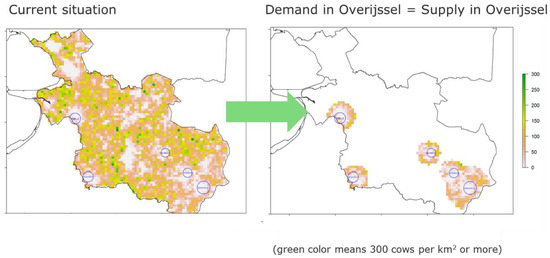 Virtual production maps (number of dairy cows per km2) for dairy production in the province of Overijssel, the Netherlands (Source: authors derived from [27]).