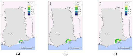 Virtual production maps (ha per grid cell) of vegetables and fruit in 2010 (a), 2030 (b), and 2050 (c) under the Ecotopia scenario with a fixed radius around Accra, Ghana [55].