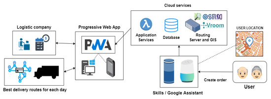 The right side of Figure 3 shows the access that the elderly person would have to the system using an IPA available in any of the devices that allow it: a SmartTV, a smart speaker, a mobile phone, etc. The user, through a dialogue with the assistant, places an order with different items for the next available delivery date for the user location. The user geographic location is at first collected automatically by the IPA, but it can be changed if requested. This order will be sent to a real-time database—the central part of Figure 3—and then processed by a set of cloud services that are listening for changes in that database. These cloud services include storage services, notification services, and Geographic Information Systems (GIS) services for the calculation of delivery routes. These services are used by a Progressive Web App (PWA) available to the logistics company team, where employees can add new orders, review existing ones, generate delivery routes, and then navigate those routes. The decision to implement this part as a PWA facilitates its use from different platforms (Desktop/Mobile/Web) and allows the use of notifications. The operation of the previously described elements is detailed below.