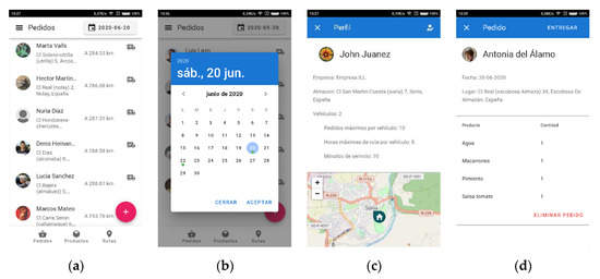 The main screen of the application—Figure 5a—includes a floating button on the bottom right corner of the screen that shows the different options available (orders, products, and routes) when clicking it. All these options are contextual following the date selected on the top right corner—Figure 5b. On the top left corner, there is a menu button that opens the user profile, which can be configured, as well as other options related to route calculation, detailed in Figure 5c.