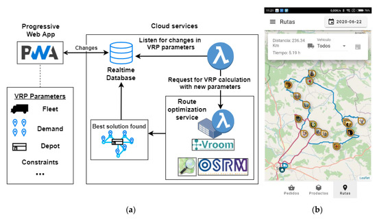 For each day, there are several customers, distributed geographically, each one of them with an order and a series of products associated with it (demand). Simultaneously, the company has a logistics center (depot) from which a certain number of vehicles will leave to satisfy the demand of these customers. The geographic location of this center can be modified in the profile section shown in Figure 5c. In this same section, the number of vehicles that the company has can be specified, as well as the capacity of orders that each vehicle can serve, and the service time per order. Initially, the problem is approached with limited restrictions, such as a homogeneous fleet of vehicles and homogeneous service times per order. This information together with the geographic information of each order for a specific day defines the parameters of a VRP problem. To find the solution to this problem (a set of routes that minimizes the total cost), a cloud service monitors the changes in the real-time database that happen in the parameters of this problem, making new calculations of the routes for that day from the changes detected in the input parameters of the problem. This cloud service interacts with another cloud service responsible for route calculations that implement the VRPTW calculation algorithms and has access to a routing engine with geographic information from OpenStreetMaps. Figure 6a shows a diagram of the communication and routing process for the described cloud services. The route optimization system has been implemented using VROOM [32], which is an open-source software developed in C++ to solve vehicle routing problem variants such as VRPTW. Vroom relies on data from OpenStreetMaps [36] for geographic information and data from a routing engine, in this case Open Source Routing Machine (OSRM) [37] has been used to obtain the cost matrices between the different nodes. Regarding the algorithm used by VROOM to solve VRPTW problems, they combine a dedicated clustering heuristic using spanning trees for creating clusters and monitoring constraints, then it solves a TSP instance for each cluster, and finally it applies a later phase of local search to improve the solutions found [38]. We have selected this platform for the proposed system because is completely open source and it scales for bigger VRPTW instances.