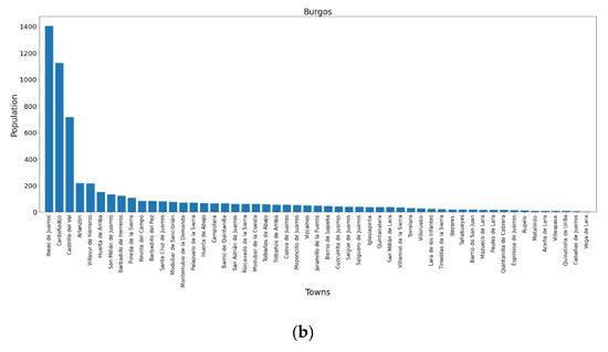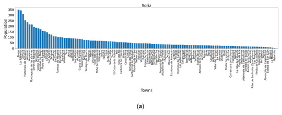 The company taken as basis of the case study regularly operates a series of routes certain days of the week in two depopulated regions of Castilla y León: Soria and Burgos. The population of the villages where they operate is shown in Figure 8a (Soria villages population) and Figure 8b (Burgos villages population). As shown in both charts, these are two depopulated rural areas where most towns have fewer than 250 inhabitants.