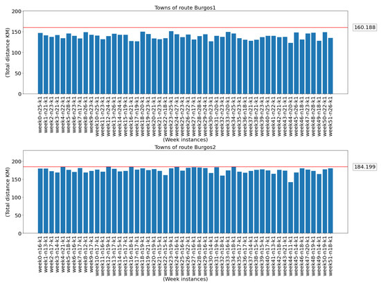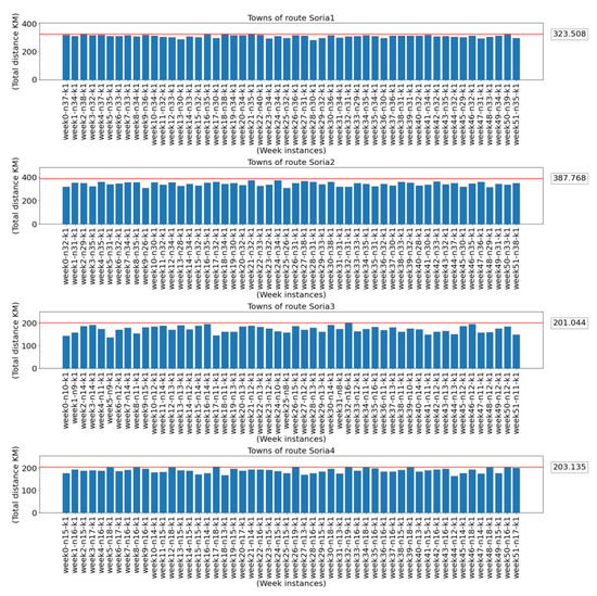 The savings derived from avoiding trips to certain towns without demand were evaluated with the calculation of dynamic routes for each of the sets of villages in Soria and Burgos described above. Figure 10 and Figure 11 show the results of the 52 simulated delivery weeks for each of the sets of villages on the routes described above. In these figures each of the bars represents the total distance in kilometers for each week against the red horizontal line showing the fixed cost of the static approach.