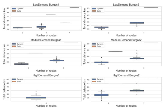 Figure 12 shows the results obtained after the simulations for each group of towns in the Burgos routes, for each demand scenario, comparing the distance in km of dynamically generated routes with the routes of the static approach initially set. The demand parameters together with the above mentioned constraints can be seen to cause at least two vehicles to be needed in the solutions obtained. Likewise, as in the previous case study, it is possible to see the savings produced compared to a static approach. In this case it is possible to see how this saving becomes more evident when the demand is higher. In the same figure it is possible to observe the fixed costs in distance as a horizontal line, since the distance of the all routes in the static approach does not change, versus the variable costs presented by the dynamic approach, the latter being lower in most situations. In the results for this case study, it can be seen how, when faced with a significant variation in demand, dynamic route calculation becomes a necessary tool to reduce travel costs.