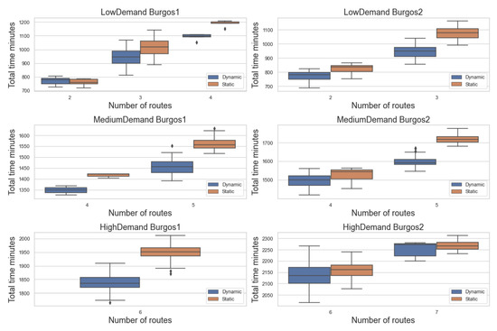 Figure 13 shows the results of total route times. For the static approach, the travel time and the service time that the route would have in each of the instances generated in the simulation was calculated. In this image, it is possible to observe how in scenarios with low demand the times can become similar, since the fixed routes have been set with an equitable demand. It is possible to highlight, as in the previous figure, time savings in many cases with this dynamic route calculation.