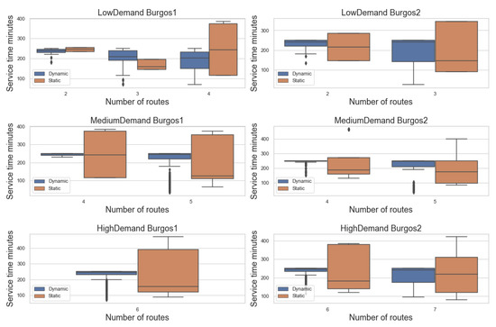 Finally, Figure 14 shows the results obtained from the service times of each of the routes of the solutions obtained. Using a static approach that takes demand into account will lead to very uneven routes causing problems in the shifts of the drivers in the fleet and resulting cost surpluses. The dynamic approach applying the restrictions mentioned above allows the calculated routes to be more homogeneous and not to affect the drivers of the vehicle fleet.