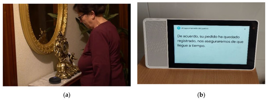 Regarding the use of IPA as a means to place orders, it has been designed and developed employing feedback provided by people ageing between 65 and 83 years old. Initially, the conversation designed included the specification of every product thoroughly. After performing the first tests with this kind of dialogue, conversations between the users and the assistant were concluded as too long and complex to place an order. For this reason, a simple conversation approach has been applied to allow the IPA use in devices without a screen (Figure 15a) as well as in screen-equipped devices (Figure 15b), while keeping a shopping list structure. The use of devices with voice assistant and the built-in screen could be useful for other use cases where visual content is highly relevant to the user.