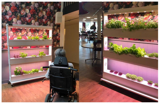 A recent niche development entering nursing homes is the high-tech indoor garden [9]. High-tech indoor gardens are a specific, smaller-scale, form of high-tech urban agriculture, in itself a relatively new phenomenon. High-tech urban agriculture uses advanced technologies, such as LED lighting and hydroponic cultivation methods, which allow the production of fresh vegetables and herbs inside the built-up environment. Due to the completely controlled environment of the growing systems neither sunlight nor soil is needed. The advantages of high-tech urban agriculture lie in the efficiency of food production, but also in its continuity (which also contributes to its efficiency): where conventional urban farming or gardening initiatives fall silent during autumn and winter months, high-tech urban agriculture practices continue throughout the year. Furthermore, hydroponic cultivation can reduce the use of pesticides by a hundred percent, due to the clean cultivation methods (no soil and manure) and the fact that the growth of plants often takes place within a closed environment to which insects have no access [10,11].